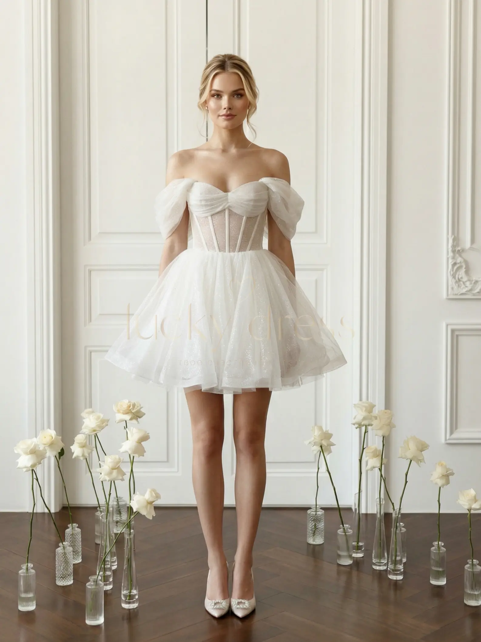 Молочное блестящее мини-платье с прозрачным корсетом и пышными спущенными рукавами.