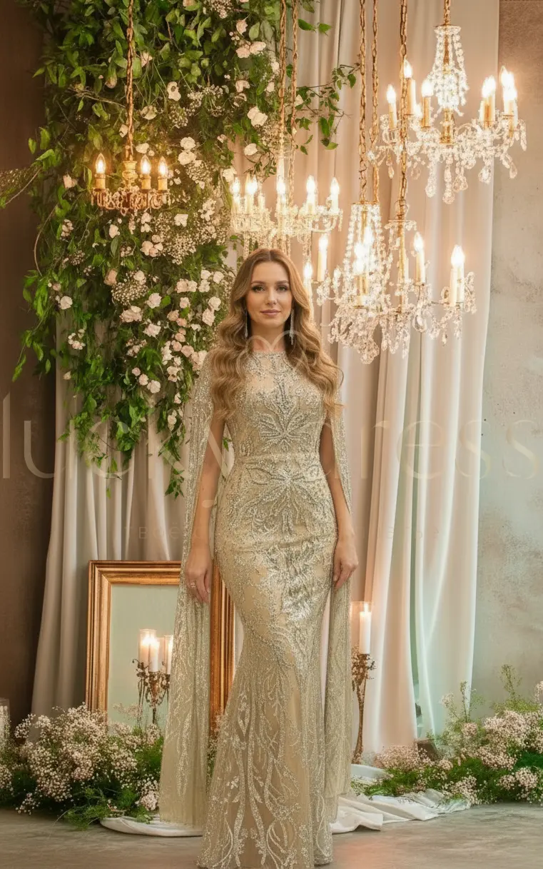 Золотое платье по фигуре с длинными рукавами