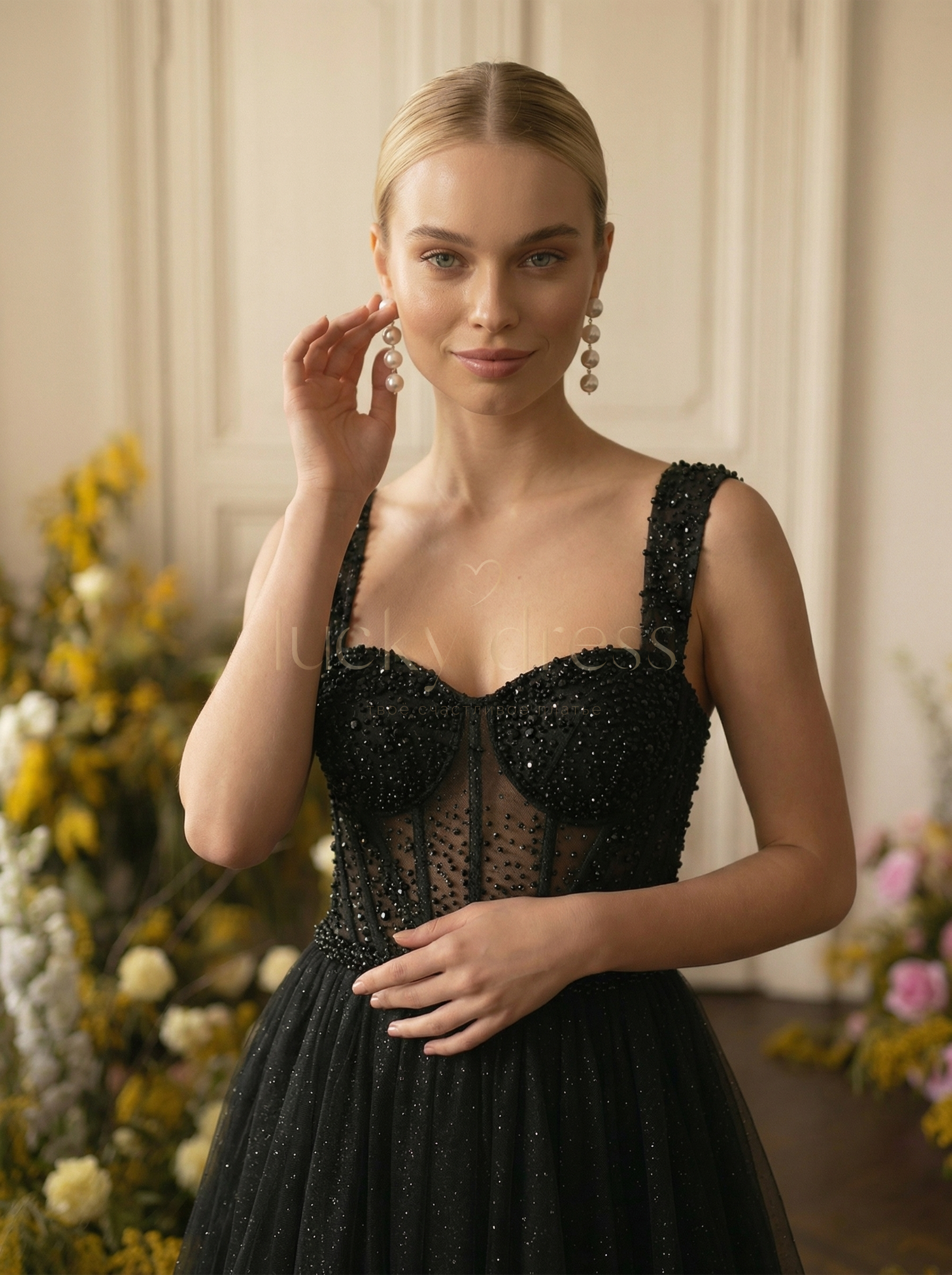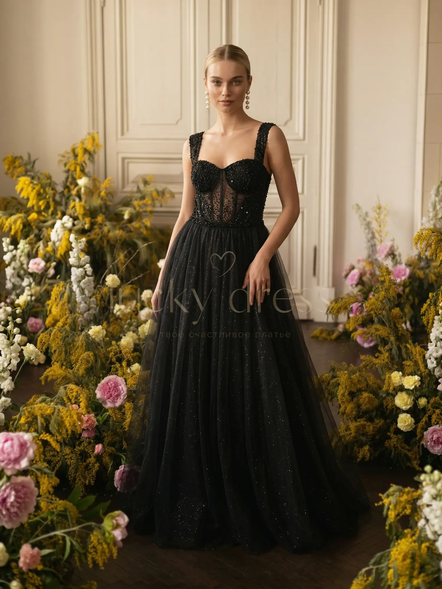 Черное вечернее платье макси с кружевным корсетом на широких бретелях и мерцающей юбкой