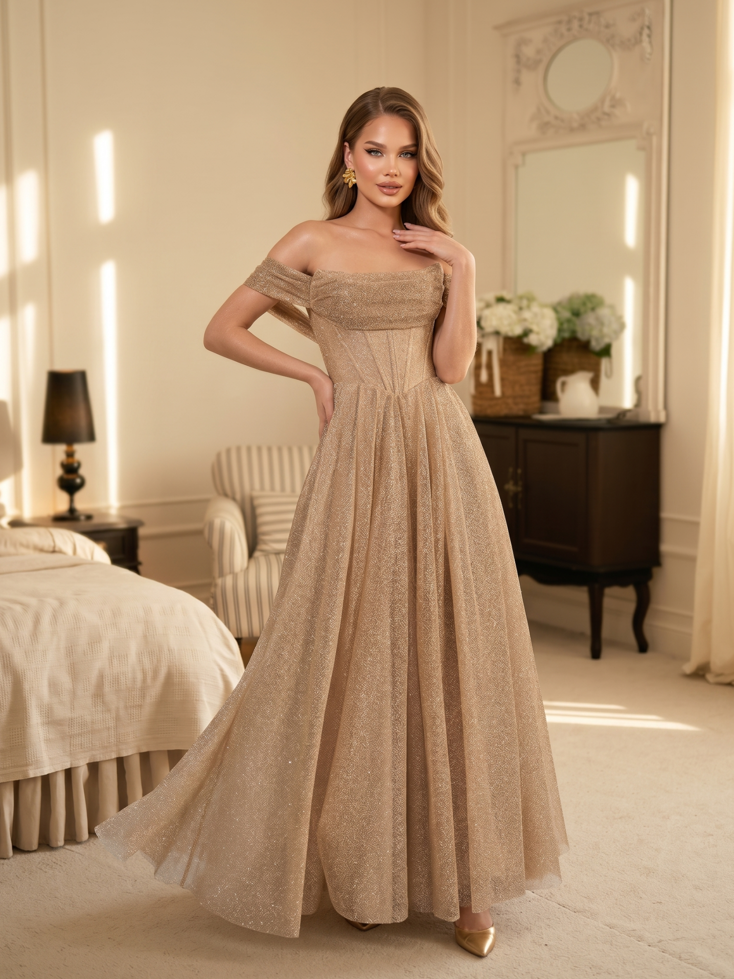 Золотое блестящее платье макси с корсетным лифом и открытыми плечами